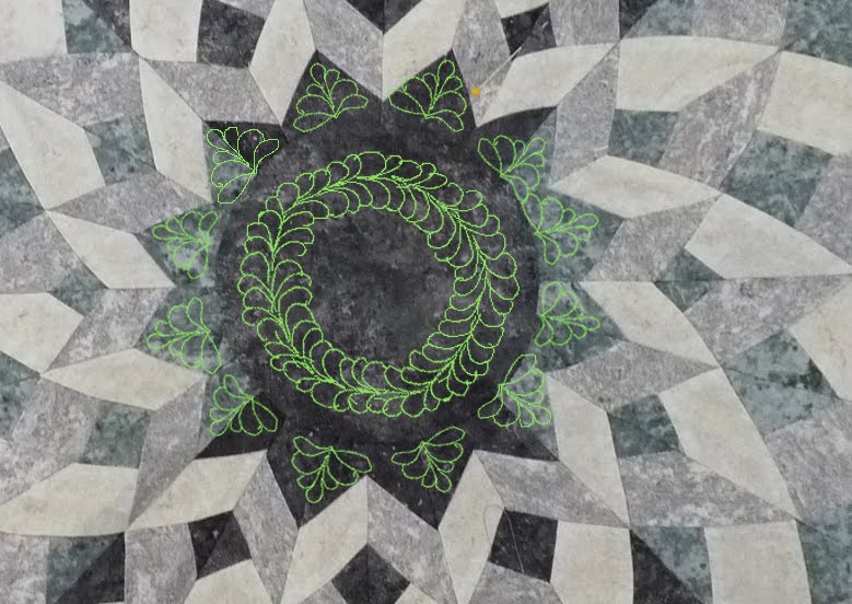 I have tried to simplify it a little. It would all be done in dark charcoal thread so no green stitches would show. The pebbling is only to make the feathering pop. As long as I have templates of the right size, I'd likely even do a double line spine so that it shows that much more.