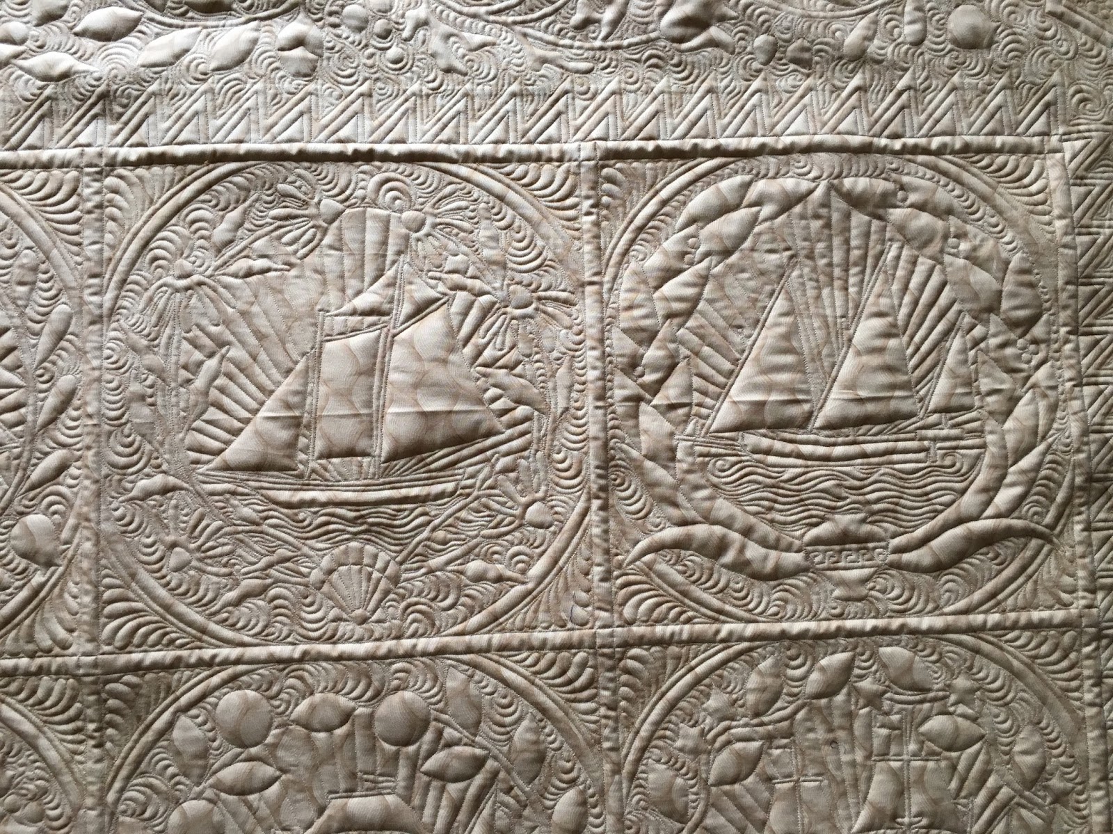 This is the center. I actually really like how this looks (even if there is a large unquilted space still!). Using several sets of parallel lines sets off the design nicely.