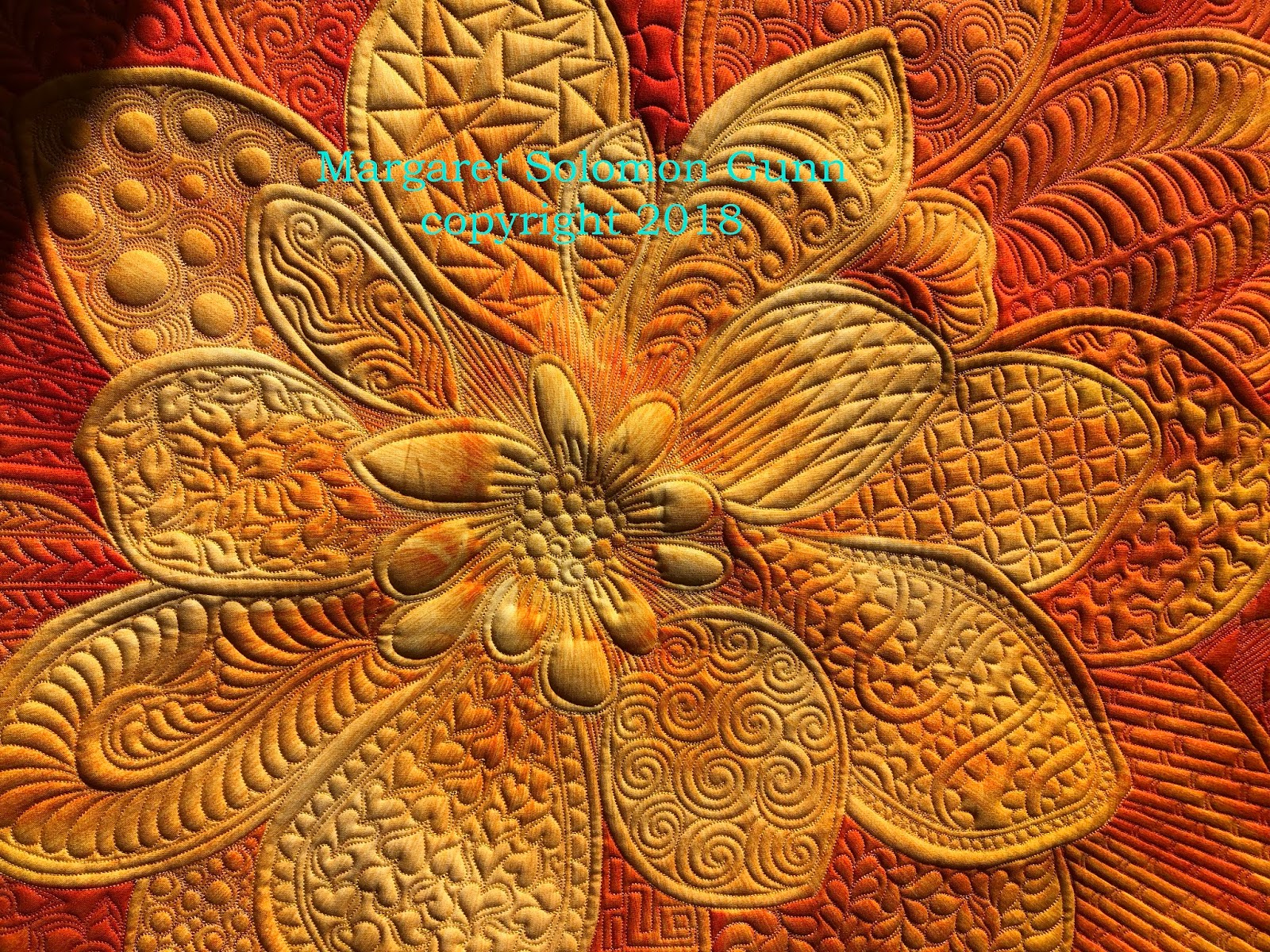 Quilted texture is just delicious! Outboard of the petals is a tight 1/8" matchstick quilting in the deepest color. It frames the quilt nicely. If you are curious how I do this, I uploaded a short video to my facebook business page today. I am not a skilled videographer, and only have my iphone as a camera, so don't expect ultra-high quality. I do think that the video addresses many of the questions I have received over the last few years.Feathers, flowers & leaves OH My!