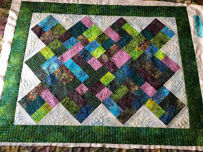 This lap quilt belongs to one of my local ladies, and forever friend of my mom's. She's an immaculate piecer, which makes my job easier. Batiks hide everything detail related so the center is just quilted with a freehand edge-to-edge. I put prettier feathers in the lighter setting triangles.